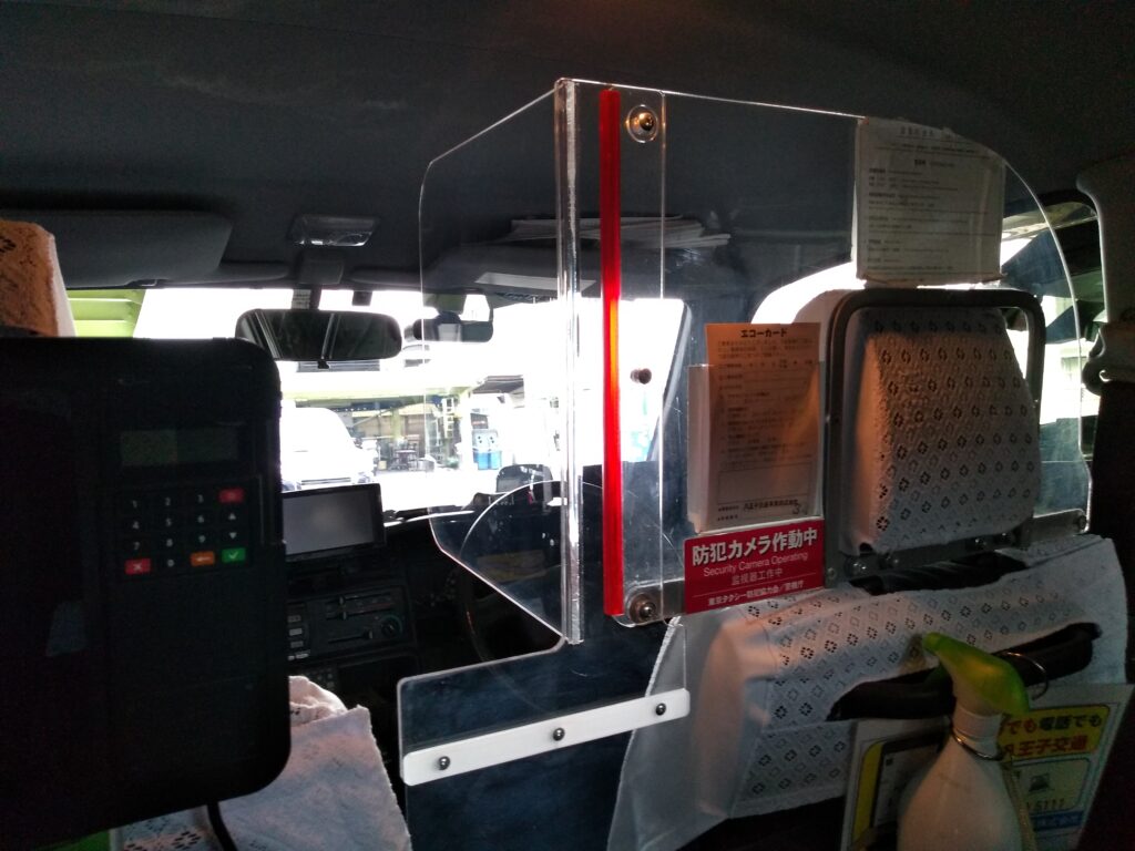 女性乗務員用防護板は左側が広くなっており、運賃や釣銭等を収受する口が設けられています。